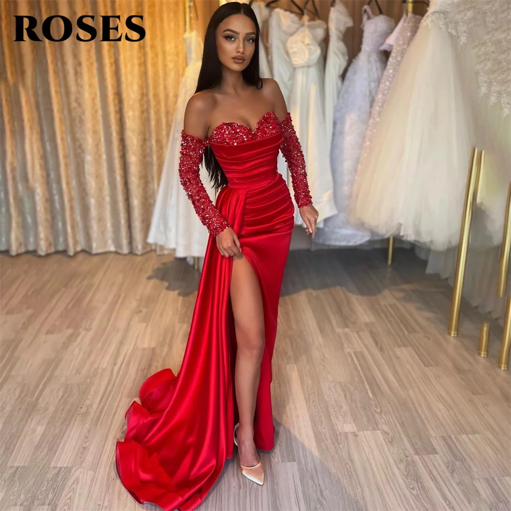 Vestido de fiesta largo rojo con hombros descubiertos, vestido de noche Vintage con lentejuelas y abertura alta, vestidos de celebridad